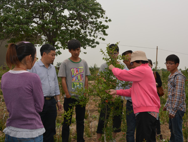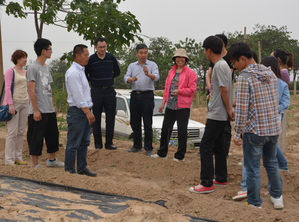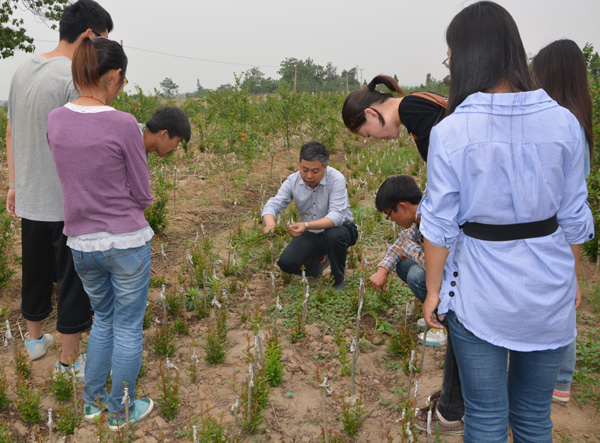 随后,冯院长一行又赶往荥阳石榴生产培育基地,久居基地的一大群有思想、好学习、朝气蓬勃的学生们全部围拢过来,一张张彰显青春活力的脸庞已明显黝黑,一个个欢快轻盈的身影显露出掩藏不住的兴奋和喜悦,一句句热情洋溢的话语表露出与老师的亲密和对知识的渴求。同学们迫不及待地把领导和老师们领到石榴地,叽叽喳喳地问个不停,院长冯建灿教授、石榴专家陈延惠教授和史江莉老师分头解答了学生们提出的有关石榴迁插、嫁接、造型、疏花疏果以及苗期管理等方面的问题,同时告诉同学们,卓越园艺师培养生产实习,不仅仅只学习园艺作物生产方面的专业技术知识,还要学习果园管理和经营以及与人交流等方方面面的知识和技巧,全面锻炼和提高自己。要通过实习,将自己在实际操作中获得的第一手材料进行数据分析,相互比较,找出差异,解答问题。要同学们多观察,多思考,多动手,多向实践学习,多向身边的人学习。